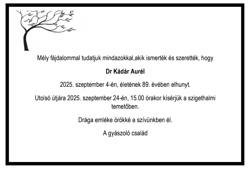 Utolsó útjára 2025. szeptember 24-én 15,00 órakor kísérjük a szigethalmi temetőben, ahol egy szál virággal fejezhetjük ki tiszteletünket, búcsúnkat, részvétünket.