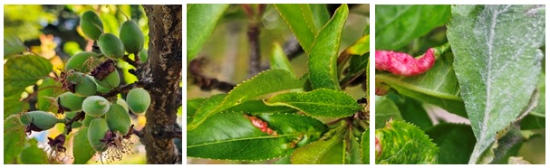 Néhol még ma hajnalban is fagy kínozta a fáinkat, a virágzó szamócát. A gyümölcsfáink fagyok utáni megsegítéséről szólt az 5. felhívás. Remélem, hogy az április 23-án fotózott Gönci magyar kajszi sem fázott meg és ki tudja nevelni a szépen sorakozó barackjait. A hűvös időben még a tafrina sem állt le. A piros hólyagokkal induló tünetét 04.21-én találtam, de a fertőzés már 7-10 nappal korábban megtörtént. Akkor kellett volna védekezni (3. felhívás).